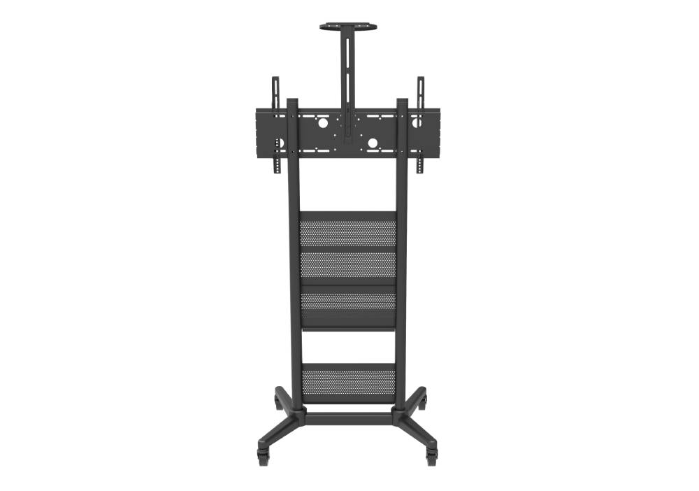 Мобильная стойка для дисплеев 32-75. Имеет прочное основание и блокируемые колесики. Полка для медиаплеера позволяет регулировать его положение по высоте.