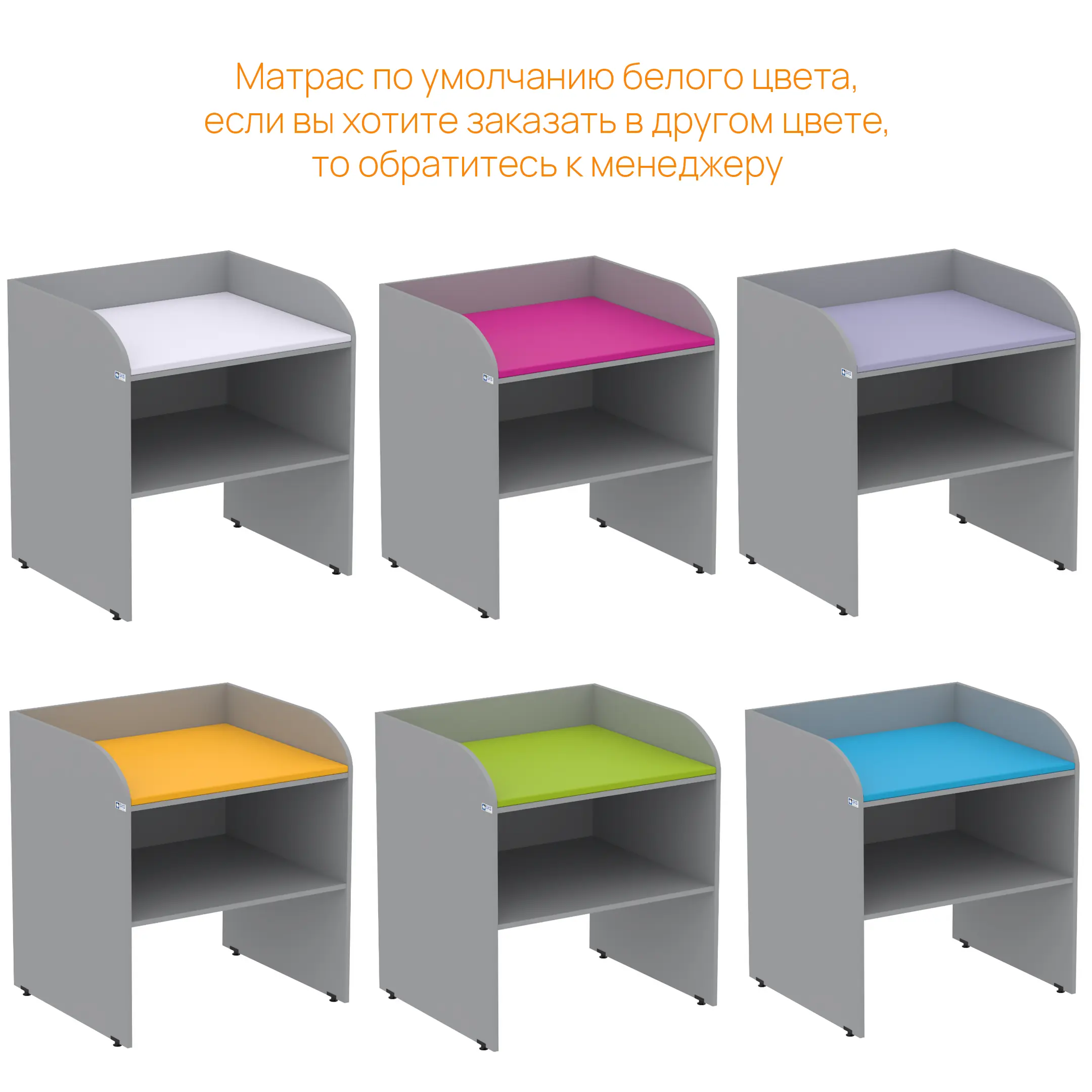 - Комплектация мягким матрасом — матрас белого цвета входит в стандартную комплектацию (по запросу доступны другие цвета: синий, сиреневый, лайм, оранжевый, розовый).
