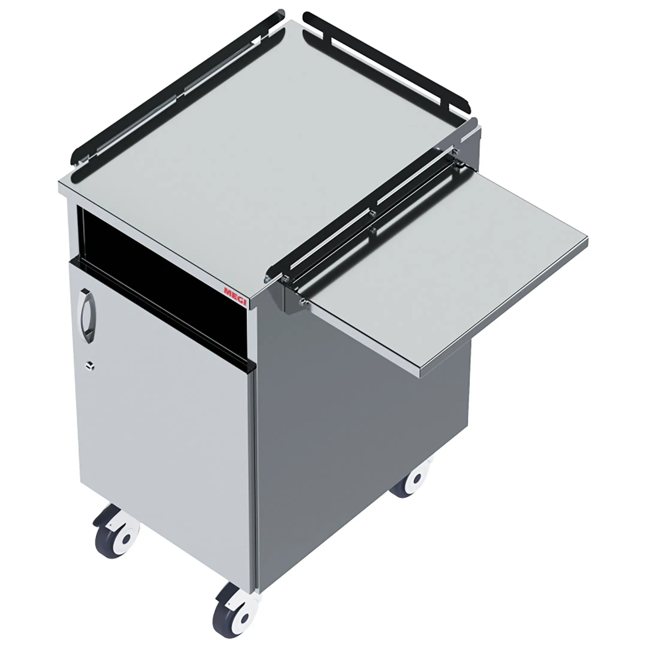 • колеса поворотные, самоориентирующиеся, диаметром 100 мм, комплектуются надёжной стальной вилкой с прецизионным радиально-упорным подшипником, ободом из полипропилена и шинкой из серого полиуретана, не оставляющего следов на полу, два колеса – с индивидуальным тормозным устройством;
