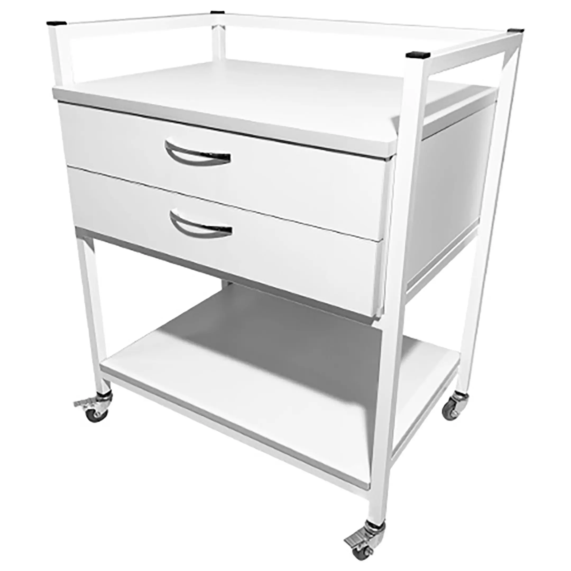 Стол лабораторный мобильный СЛм 17.002 (белый) — это идеальное решение для временного размещения и удобного перемещения различных инструментов, предметов и приборов в медицинских учреждениях и лабораториях. Модель оснащена двумя выдвижными ящиками и полкой под столешницей. Каркас выполнен из стального профиля, столешница из ЛДСП толщиной 16 мм.