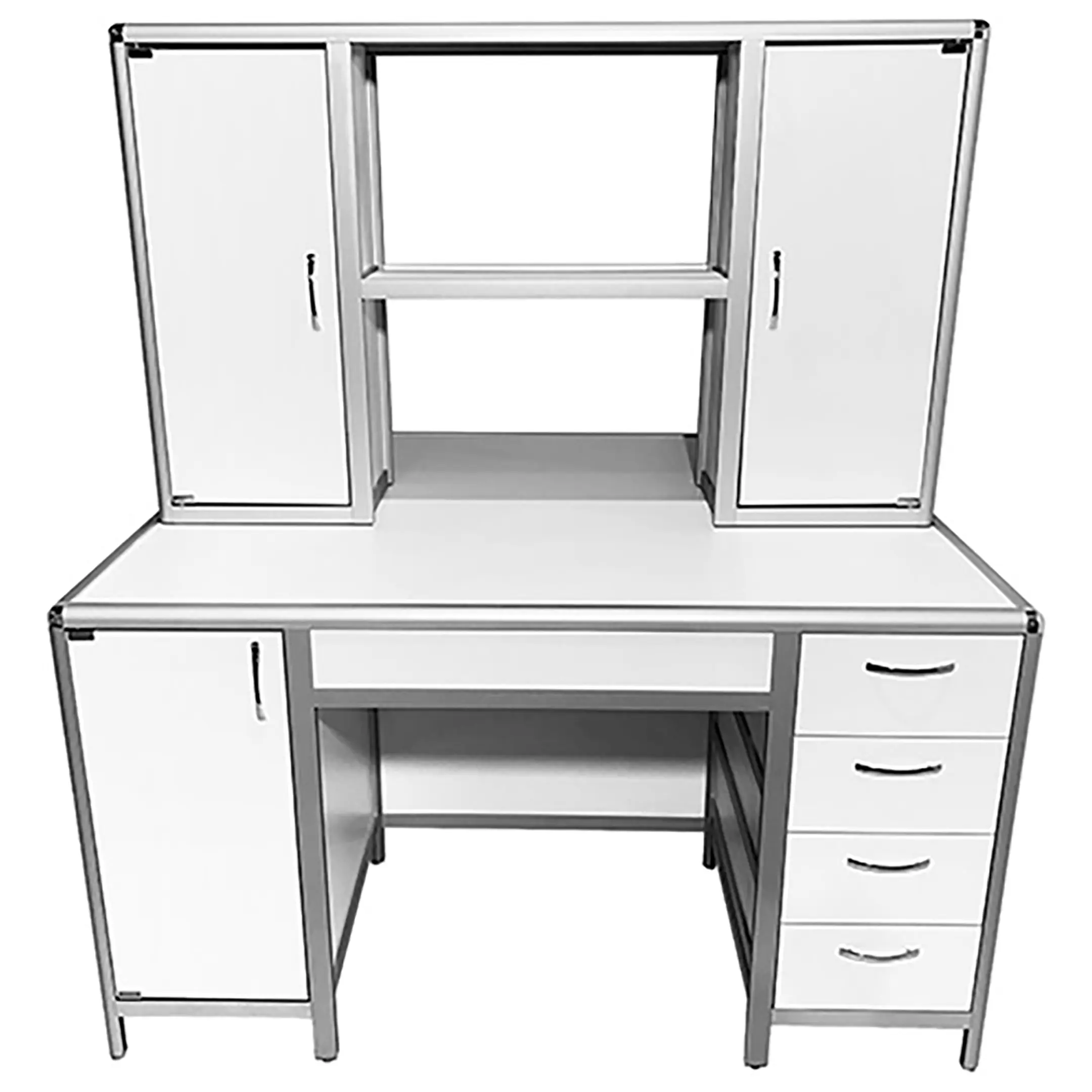 Стол лабораторный островной MED 11.004al с надстройкой (белый) — это идеальное решение для создания двух рабочих мест в лабораториях и медицинских учреждениях, обеспечивая оптимальное использование доступного пространства помещения. Модель оснащена двумя рабочими местами, каждое с двумя тумбами: одна с распашной дверкой и полкой, вторая с четырьмя выдвижными ящиками. Надстройка разделяет рабочее пространство на два сегмента. Каркас выполнен из алюминиевого профиля, столешница из ЛДСП толщиной 22 мм.