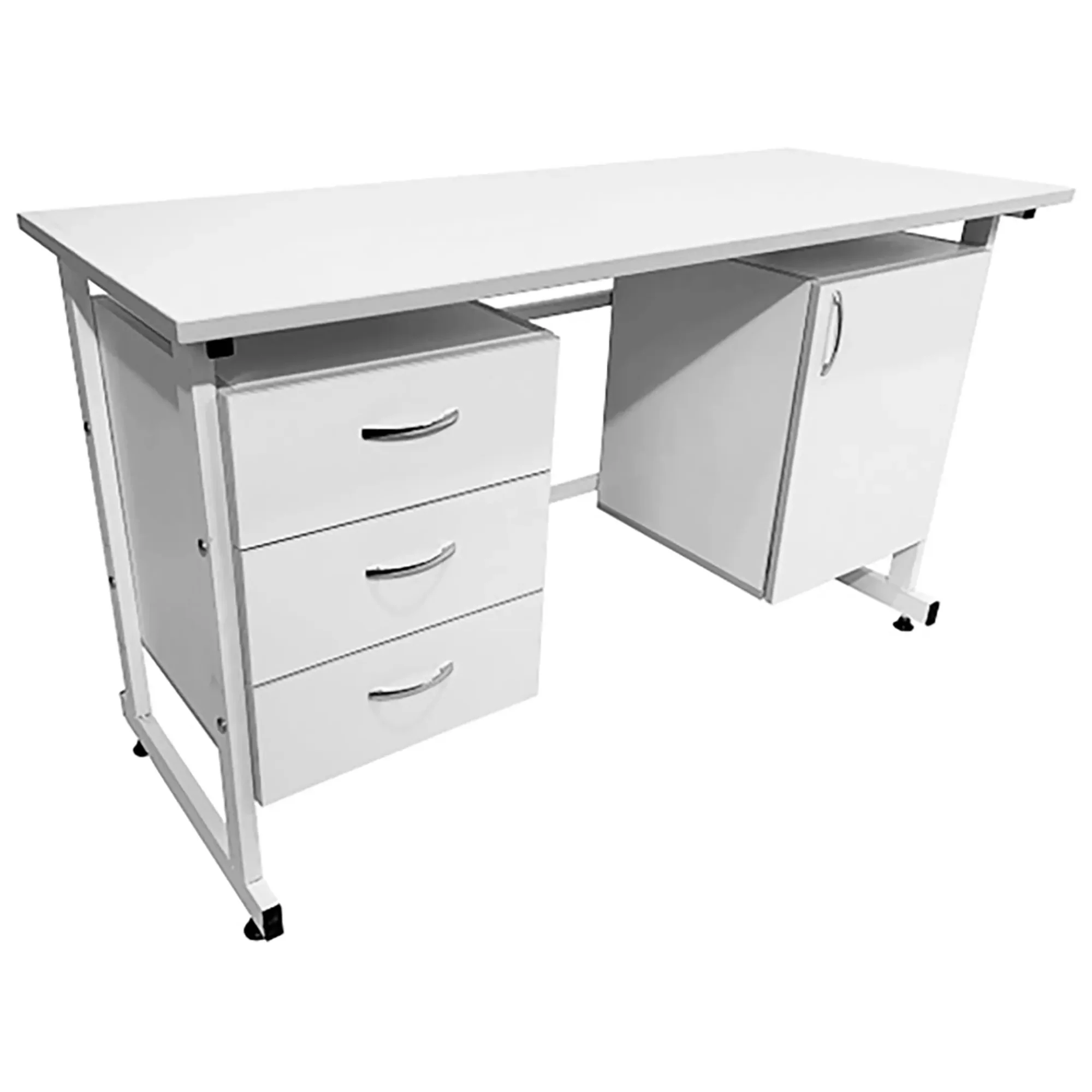 - Комбинированная система хранения — левая тумба с тремя выдвижными ящиками, правая тумба с распашной дверкой и полкой для удобного хранения материалов.