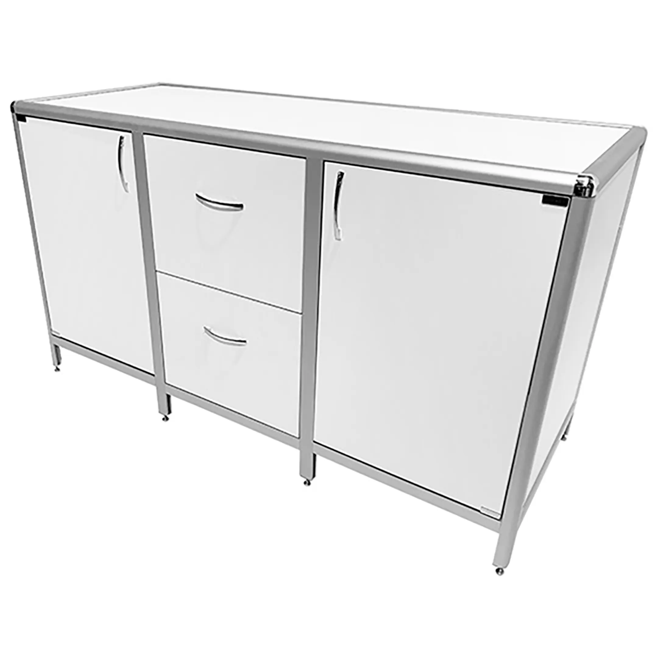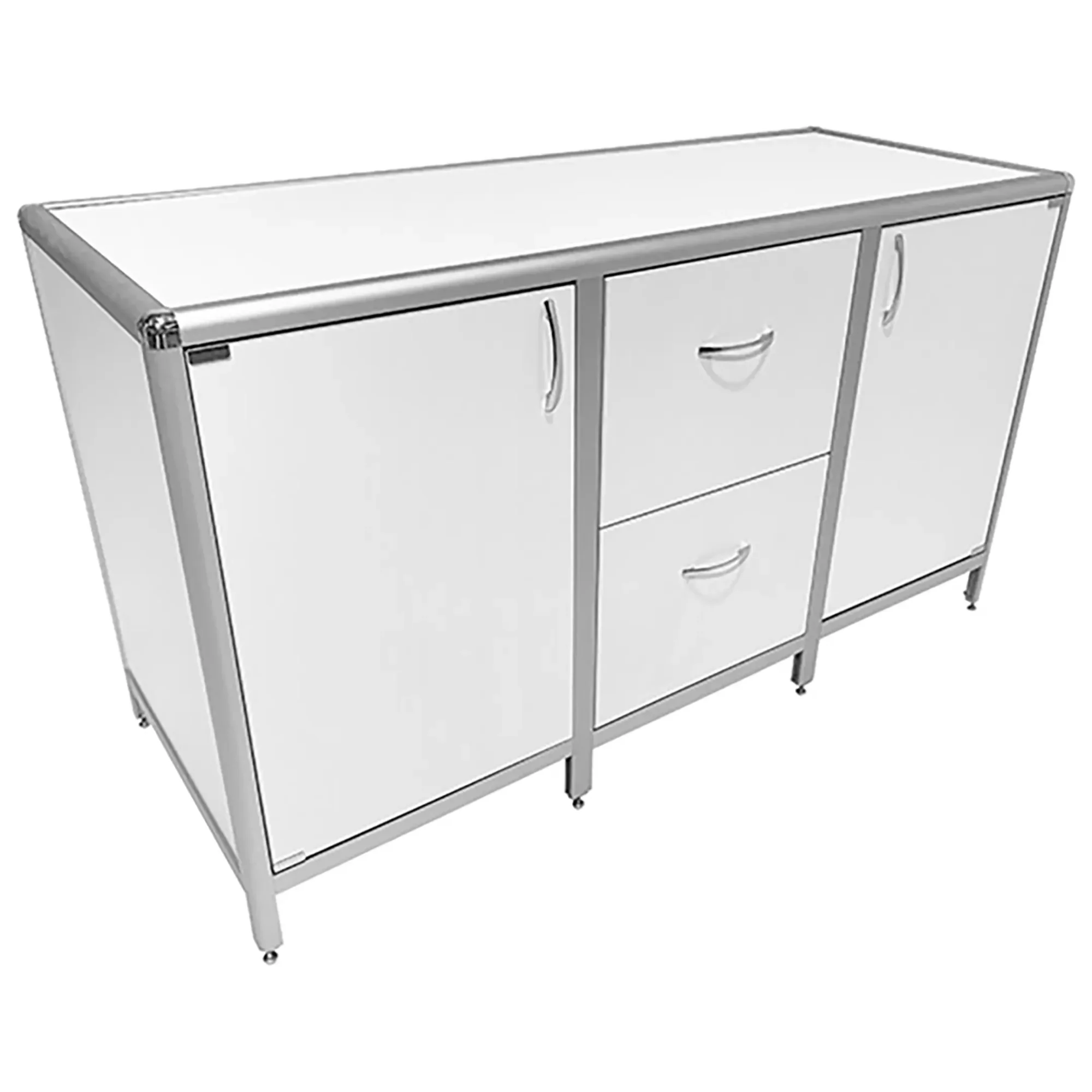 Стол-тумба лабораторная MED 12.017al (белый) — это функциональное решение для хранения лабораторного инвентаря, приборов и материалов в лабораториях и медицинских учреждениях. Модель разделена на три отдела: два боковых с дверками и полками (внутренние полки 467х545 мм), центральный с двумя выдвижными ящиками (434х260х410 мм). Каркас выполнен из алюминиевого профиля, столешница из ЛДСП толщиной 16 мм.