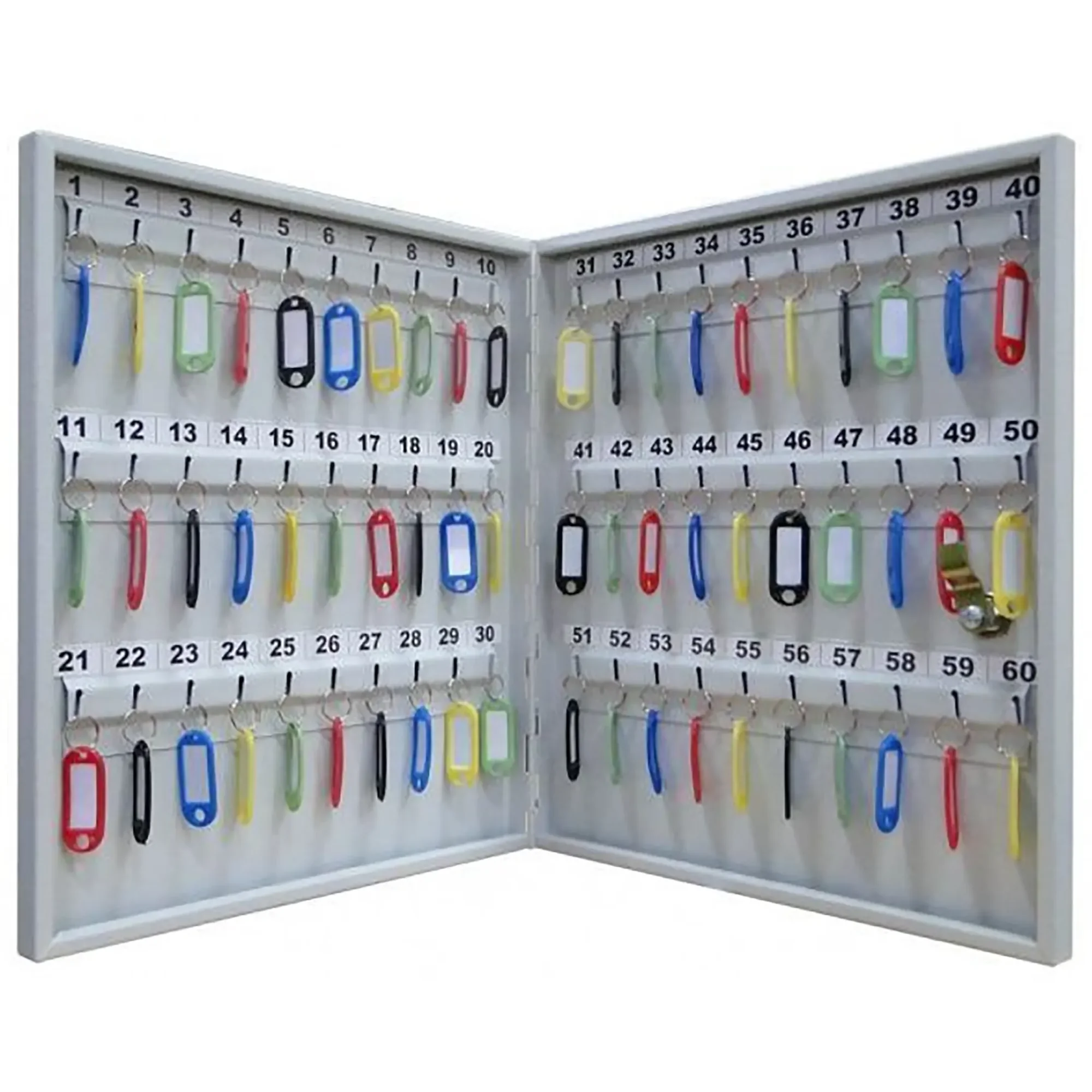 - Четкая организация и мгновенный доступ — шестьдесят пронумерованных ячеек и комплект брелков создают прозрачную и понятную систему хранения. Это позволяет быстро находить нужный ключ, вести базовый журнал учета и легко контролировать, кто из сотрудников получил тот или иной ключ.