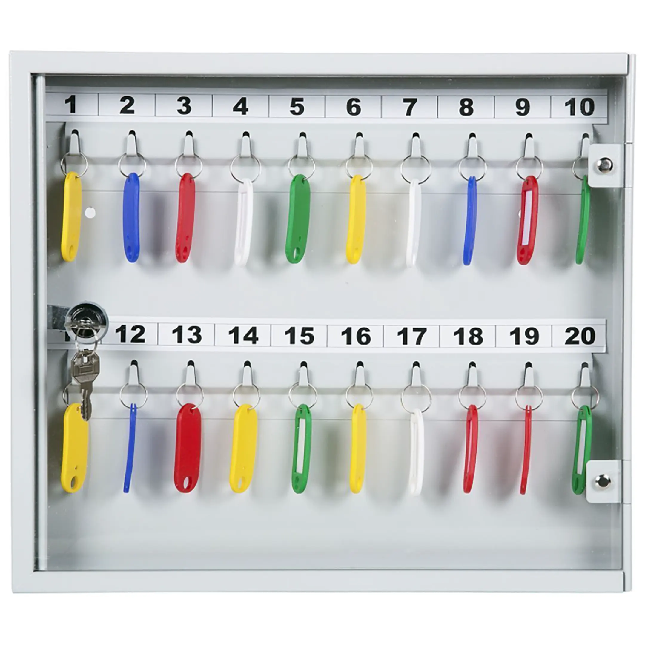 Ключница с прозрачной дверцей КЛС-20 (с брелками) — это практичная и наглядная система для организованного хранения ключей в учреждениях и на предприятиях. Конструкция со стеклянной дверцей и полным комплектом брелков обеспечивает удобный визуальный контроль, быстрый поиск и надежную защиту для 20 комплектов ключей.