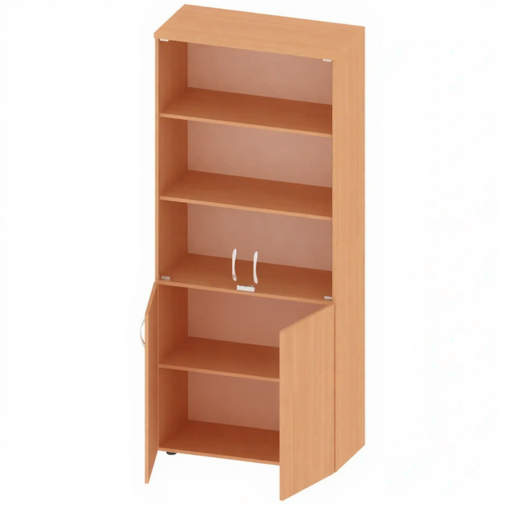 - Функциональность — две полки за стеклянными дверями и одна полка за глухими дверями для удобного размещения документов.