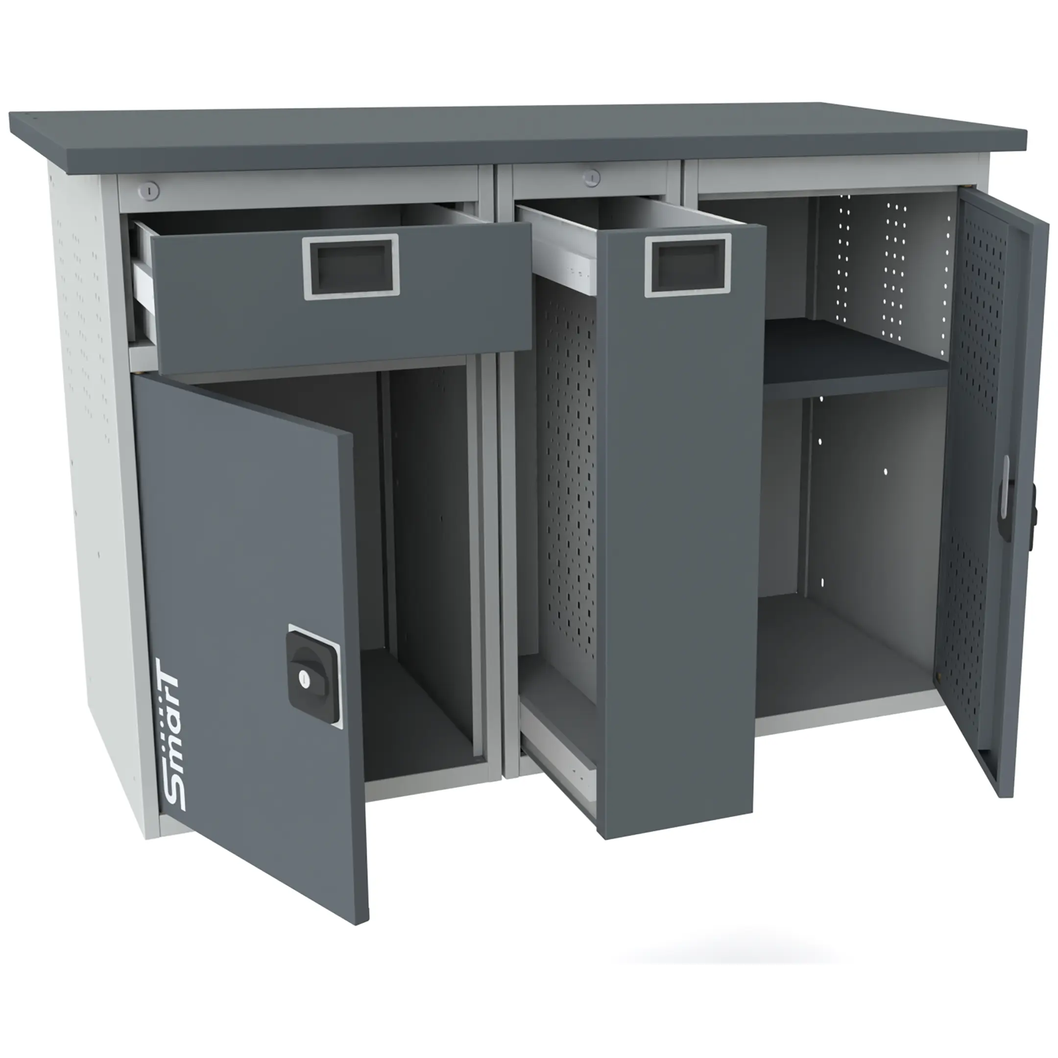 - Универсальная перфорация — внутренние стенки дверей и боковые стенки имеют перфорацию для размещения крючков и держателей инструмента.