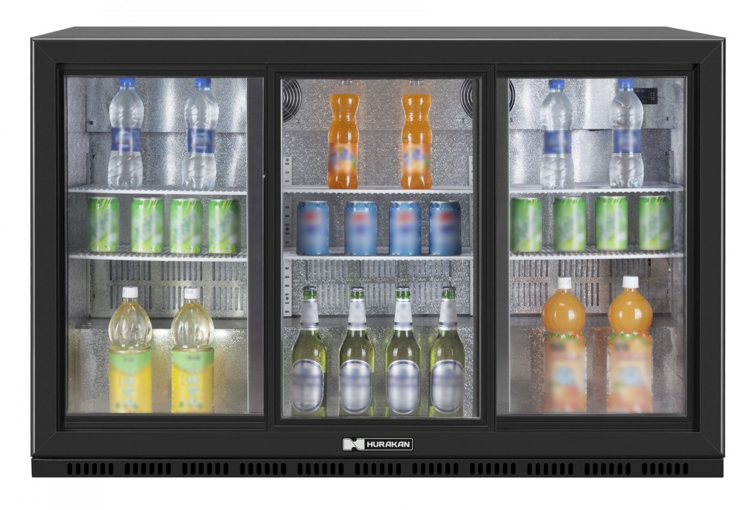 Особенности Вместимость - 224 бутылки/банки. Размер полок: 395x325 (левые и правые), 436x325 (средние). Вентилируемая циркуляция воздуха. Плоские стеклянные раздвижные двери с возвратным механизмом. Встроенная панель управления. Электронный термостат. Регулируемые ножки (максимальная высота шкафа с учетом ножек 880мм). 2 замка на центральной дверце (1 слева и 1 справа). Хладагент R600a. Уровень шума 45-50 Дб Подсветка. Замок. Описание Шкафы барные холодильные Hurakan HKN-DB335S предназначены для хранения напитков, молочных и других продуктов с требуемой температурой хранения выше 2-10°с. стандартная конструкция позволяет устанавливать шкафы под барной стойкой или демонстрировать содержимое покупателям.
