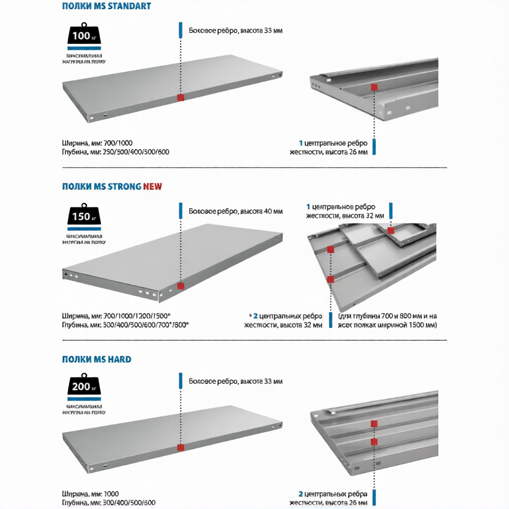 • каждая полка усиливается 1 или 2 (в зависимости от габаритов) центральными ребрами жёсткости высотой 32 мм;