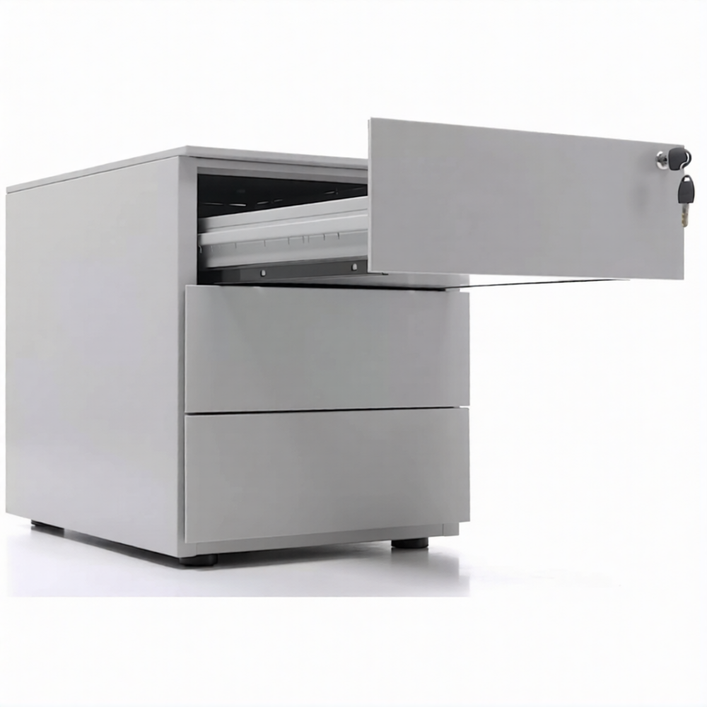 Опции: пластиковые лотки и металлический ящик для канцелярских принадлежностей и других предметов. Возможность комбинирования цветов: корпус + фасады ящиков и крышка (конструкция тумбы металл+металл). Или отделка фасадов ящиков и крыши тумбы ламинированной плитой ЛДСП (конструкция тумбы металл+ЛДСП)