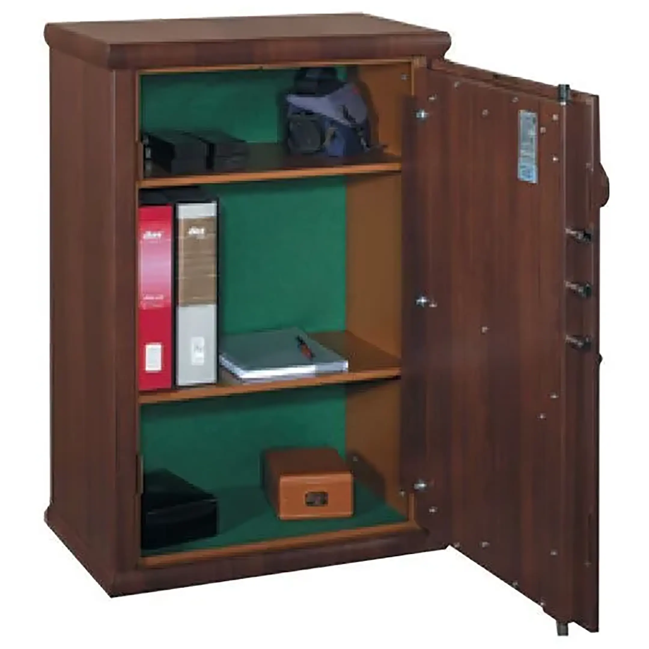 Сейф относится к классу элитных сейфов для хранения документов и ценных предметов в офисе или доме. Трехсторонний ригельный механизм закрывания, со стержнями из легированной стали диаметром 22 мм под электронным кодовым управлением. Спрятанные изнутри дверные петли, толстый металл корпуса - соответствует классу взломостойкости S2. Внутренняя поверхность обшита зеленым сукном и оборудована 2 полками для предметов. Внешняя поверхность сейфа окрашена под благородные сорта дерева. Доступны несколько вариантов (дуб, вишня, грецкий орех, клен). Предусматривает два варианта монтажа – крепление к полу или стене.