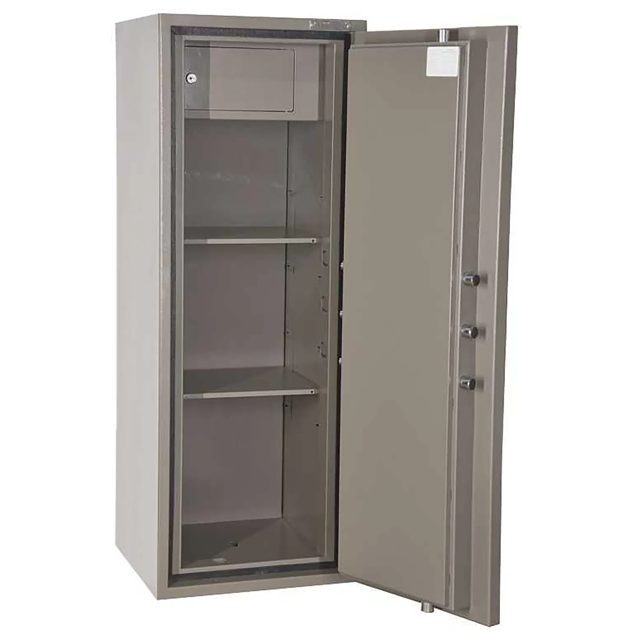 • Сейф односекционный, оснащен двумя съемными полками и Трейзером.