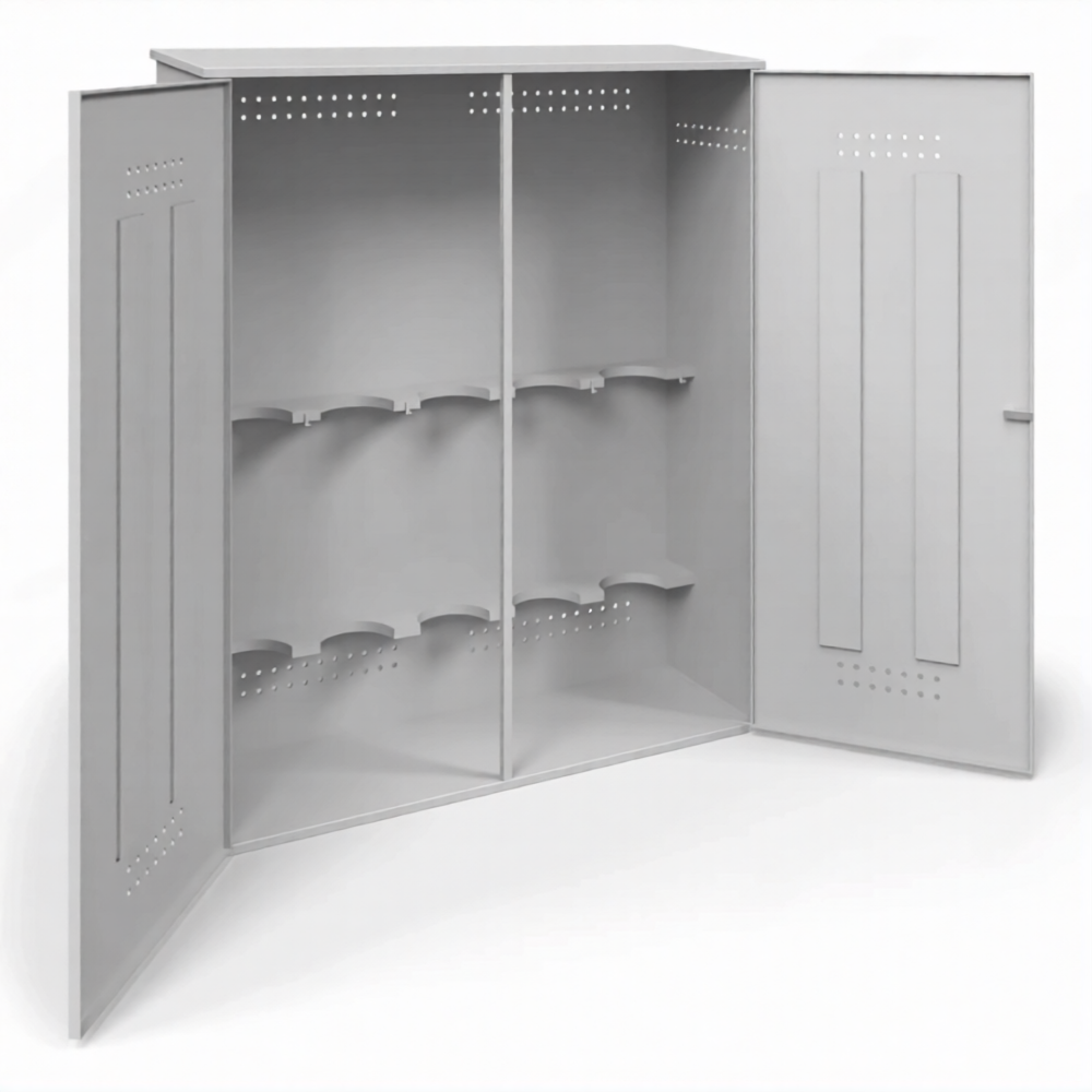 - Надежная защита от хищений и вандализма — усиленная сварная конструкция, массивные петли и возможность установки серьезных запорных устройств (навесные замки повышенной секретности, врезные замки) делают этот шкаф настоящим сейфом для газовых баллонов, эффективно защищающим дорогостоящее имущество даже на неохраняемых территориях.