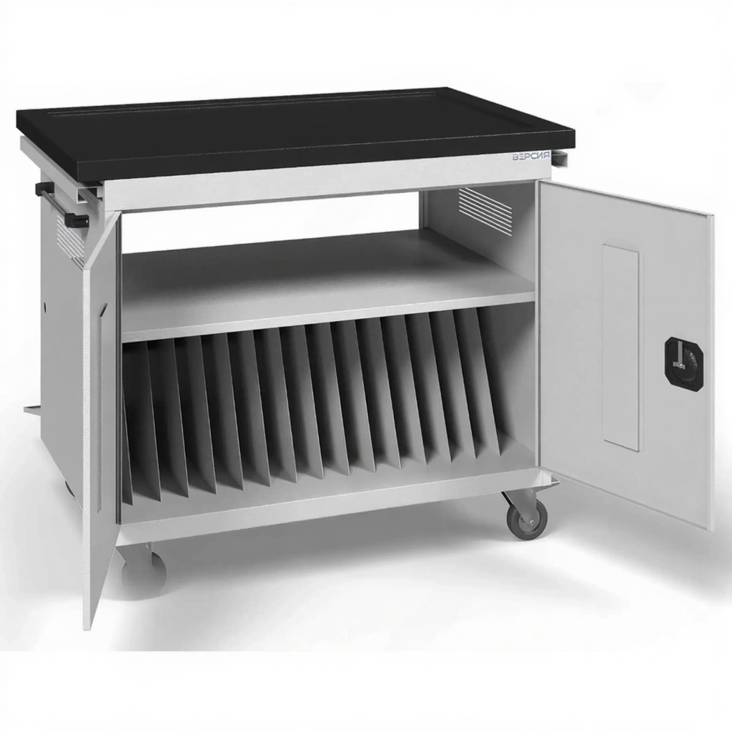 - Универсальность хранения — подходит как для ноутбуков, так и для планшетов популярного формата 15,6 дюйма, что позволяет использовать одну тележку для разного типа устройств в зависимости от потребностей.
